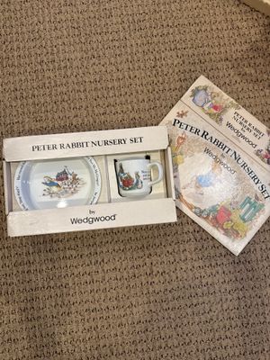 Brand new Peter rabbit three piece Wedgewood Collectors item set online for over $100 box has aging and wear