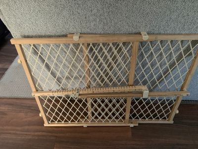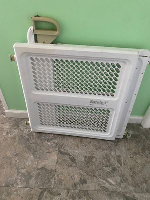 Safety First gate Pressure close on wall Stands 26 inches tall Opens 45 inches Has screws